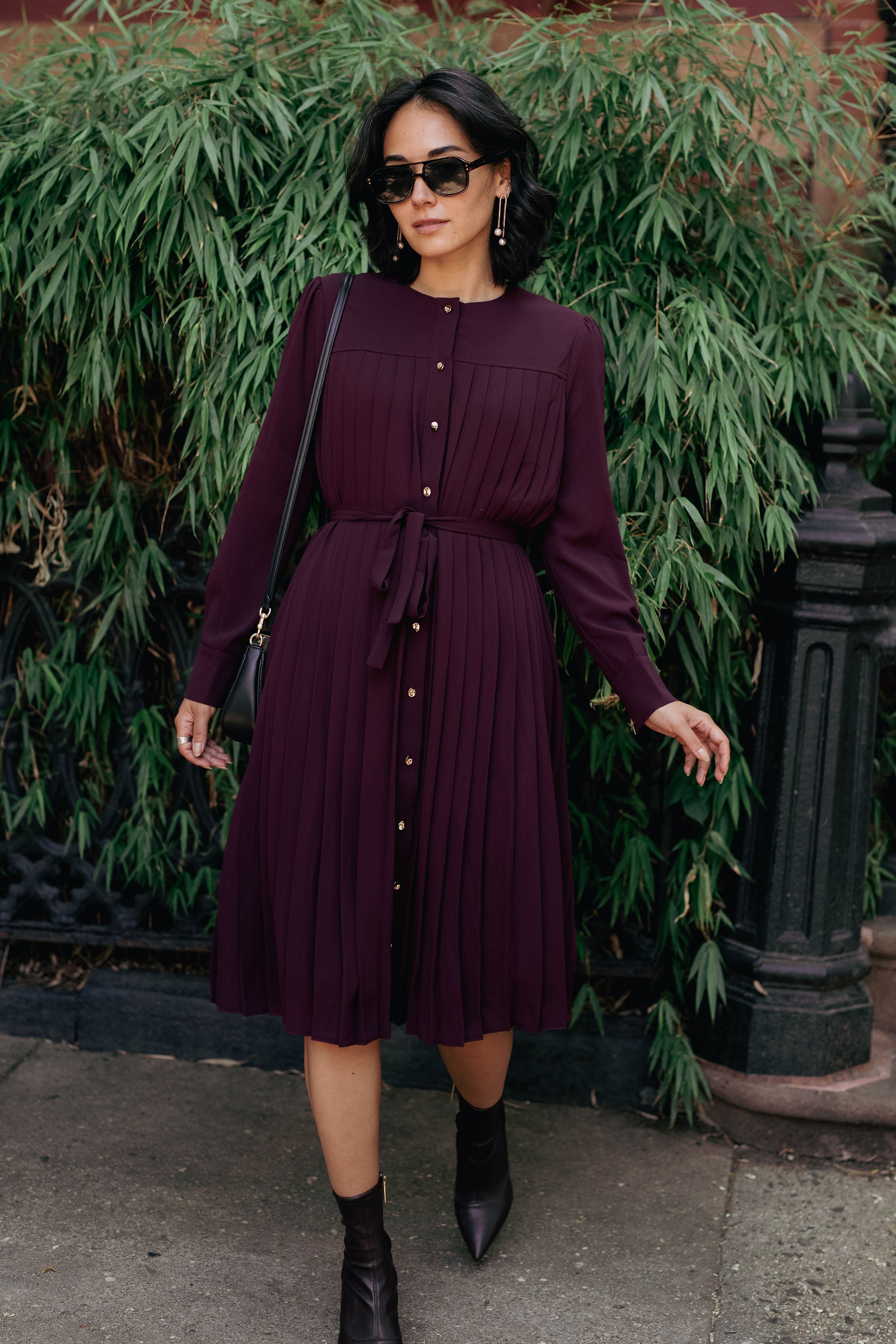 Pleated button-down dress - Maroon