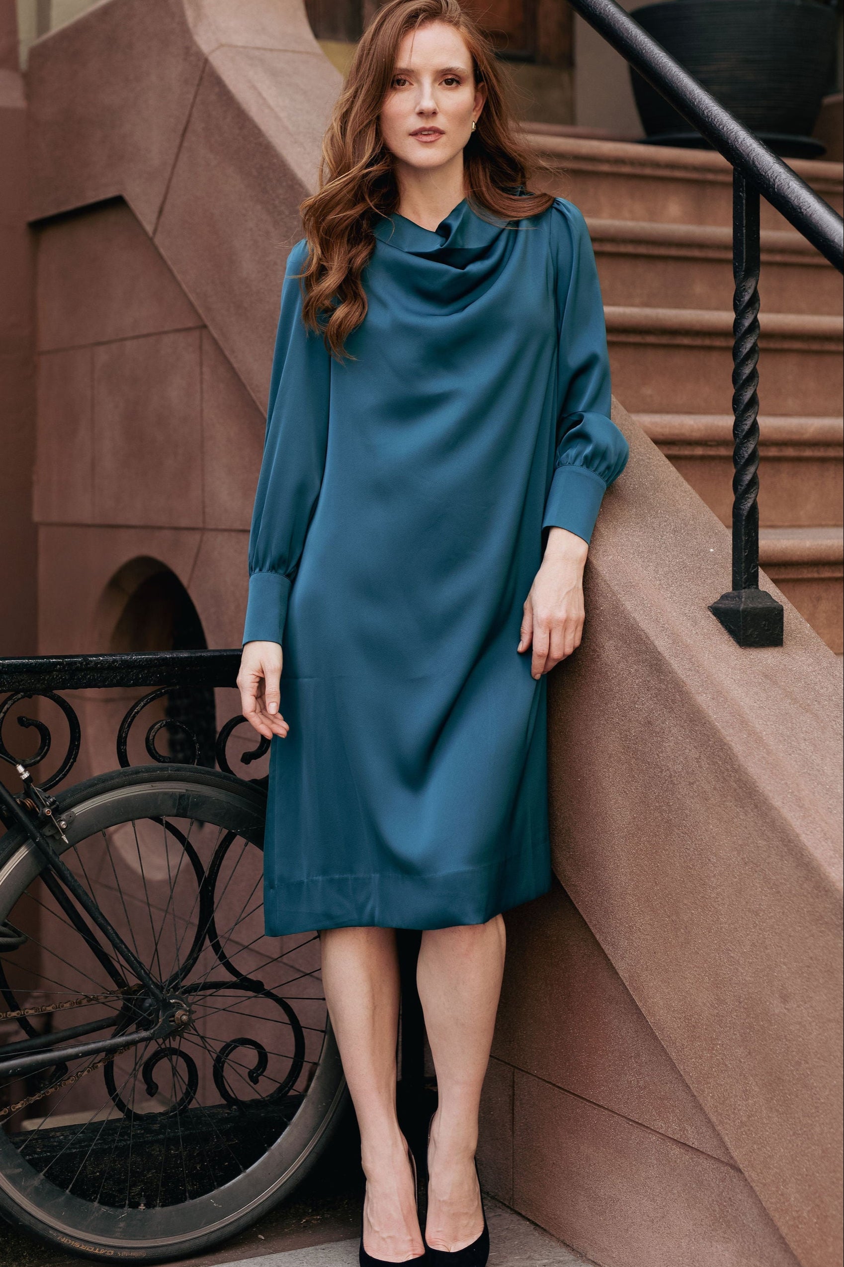 An elegant satin modest dress, perfect for weddings, evening events, date nights, and other special occasions. Designed with a sophisticated cowl neckline and long sleeves with tailored cuffs, it offers a refined and graceful appearance. The coordinating belt with gold-tone buckle allows versatile styling, cinched at the waist for a feminine silhouette or worn loose for a flowing, comfortable fit. This modest formal dress combines timeless elegance with a flattering design, making it ideal for maternity, plus size, and regular sizes. A perfect choice for those seeking an elegant dress for events, modest wedding guest dress, or a sophisticated evening dress.